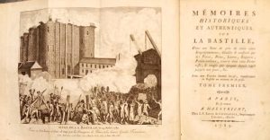 79. [CARRA (Jean-Louis)]. Mémoires historiques et authentiques sur la Bastille. Dans une suite de près de trois cents emprisonnements, détaillés et constatés par des pièces, notes, lettres, rapports, procès-verbaux, trouvés dans cette forteresse, et rangés par époques depuis 1475 jusqu'à nos jours, etc. À Paris et se trouve à Maestricht, chez J. P. Roux et Cie, 1789, 3 vol. in-8, XVI-286 pp., 296 pp. et 271 pp., 1 planche dépl. en frontispice, demi-veau brun, dos lisses ornés, fleurons, palettes et grecque dorés, pièces de titre et de tomaison, tranches rouges (rel. de l'époque). Papier des plats sali et empoussiéré, l'un d'eux sans le sien. Dos ternis, une coiffe arasée (petit mque de cuir), un accroc à une autre, coupes frottées et petites usures aux coins.