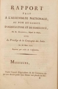 93. [COMPAGNIE DES INDES] - HERNOUX (M.). Rapport fait à l'Assemblée Nationale, au nom du Comité d'Agriculture et de Commerce, sur le privilège de la Compagnie des Indes. Le 18 mars 1790. Paris, Baudouin, 1790, in-8, 34 pp. et 34 (pièces justificatives)-[2] pp., bradel papier marbré (rel. moderne).