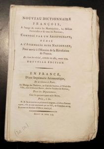 102. [CONTRE-REVOLUTION] - Nouveau dictionnaire françois, à l'usage de toutes les municipalités, les milices nationales et tous les patriotes, composé par un aristocrate, dédié à l'Assemblée dite nationale, pour servir à l'histoire de la Révolution de France. Nouvelle édition. En France, et se trouve à Paris, d'une imprimerie aristocratique, août 1790, in-8, [2]-ij-133 pp., un f. n. ch. de table, en feuilles, cousu.