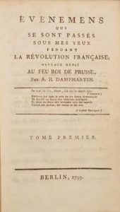110. DAMPMARTIN (Anne-Henri Cabet de). Evénemens qui se sont passés sous mes yeux pendant la Révolution française. Ouvrage dédié au feu Roi de Prusse. Berlin, s.n., 1799, 2 tomes en un vol. in-8, [12]-307-[4] pp. et [4]-256 pp., veau fauve écaille, dos lisse orné de filets dorés, pièce de titre cerise, hachuré doré sur les coupes, tranches citron (reliure de l'époque). Coiffes restaurées. Accidents restauré aux pages 4 à 6 avec perte de quelques lettres.