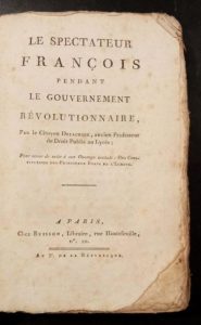 113. DELACROIX (Jacques-Vincent). Le Spectateur françois pendant le gouvernement révolutionnaire, pour servir de suite à son ouvrage intitulé : Des Constitutions des principaux états de l'Europe. À Paris, Chez Buisson, an III, (1795), in-8, XII-416 pp., broché sous couv. grise d'attente, étiquette (abîmée) au dos. Petit manque au dos, qqs rousseurs.