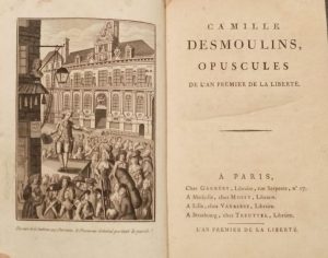 Recueil des écrits de Camille Desmoulins avec une page de titre imprimée pour l'occasion et le frontispice du Discours de la lanterne. On y trouve les textes suivants :