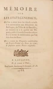 120. [DESPREZ (Abbé)]. Mémoire sur les États-Généraux ; ou l'on a réuni tous les détails relatifs à la convocation aux Assemblées de Bailliages, de Villes & de Paroisses, au nombre & à la qualité des Députés, enfin à la confection des cahiers & à la forme de délibération que l'on suit dans les Etats. A Lausanne, Et se trouve à Paris, Rue Jacob, 1788, in-8, [4]-VI-188 pp., bradel papier marbré (reliure moderne). Qqs rousseurs. Qqs traits dans les marges.