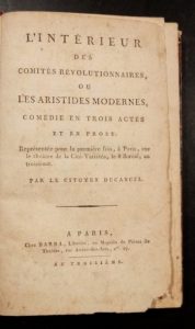 134. DUCANCEL (Charles-Pierre). L'Intérieur des comités révolutionnaires, ou Les Aristides modernes, comédie en trois actes et en prose : représentée pour la première fois, à Paris, sur le théâtre de la Cité-Variétés, le 8 floréal, an troisième [27 avril 1795]. Paris, Barba, an III, (1795), in-8, [4]-74 pp., demi-basane fauve, dos à nerfs orné de filets et pointillés dorés, tranches mouchetées (rel. du XIXe siècle). Dos insolé, des mouillures.