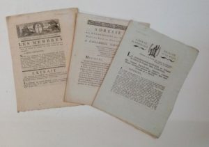 Textes de Barère, Boissy d’Anglas, Burke, Buonarotti, Calonne, Condorcet, Desmoulins, Dupont de Nemours, Louis XVI, Mirabeau, Mounier, Robespierre, Saint-Just… États-Généraux, Économie, Finances, Colonies, Emigration, Constitutions, Pamphlets… Collection d’autographes de conventionnels. Iconographie : Bonneville, Grasset Saint-Sauveur, Prieur Manuscrit dont MÉMOIRES INÉDITS de Joseph-Marie PORTALIS - Journaux révolutionnaires dont les deux rarissimes journaux de ROBESPIERRE. Collection des Drapeaux. Reliures révolutionnaires. Affiches Plus de 5000 BROCHURES RÉVOLUTIONNAIRES en recueils ou en fascicules.