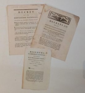 Textes de Barère, Boissy d’Anglas, Burke, Buonarotti, Calonne, Condorcet, Desmoulins, Dupont de Nemours, Louis XVI, Mirabeau, Mounier, Robespierre, Saint-Just… États-Généraux, Économie, Finances, Colonies, Emigration, Constitutions, Pamphlets… Collection d’autographes de conventionnels. Iconographie : Bonneville, Grasset Saint-Sauveur, Prieur Manuscrit dont MÉMOIRES INÉDITS de Joseph-Marie PORTALIS - Journaux révolutionnaires dont les deux rarissimes journaux de ROBESPIERRE. Collection des Drapeaux. Reliures révolutionnaires. Affiches Plus de 5000 BROCHURES RÉVOLUTIONNAIRES en recueils ou en fascicules.