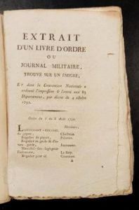 EXTRAIT d'un Livre d'Ordre, ou Journal militaire trouvé sur un émigré et dont la Convention Nationale a ordonné l'impression et l'envoi aux 83 départements, par décret du 4 octobre. A Marseille, de l'Imprimerie de Jean Mossy, 1792, in-8, 68 pp., broché, couv. papier marbré de l'époque.