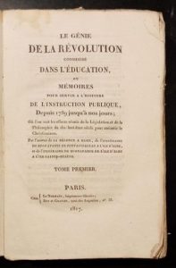 156. [FABRY (Jean-Baptiste-Germain)]. Le Génie de la Révolution considéré dans l'éducation, ou Mémoires pour servir à l'histoire de l'instruction publique, depuis 1789 jusqu'à nos jours ; Paris, Le Normant, Rey et Gravier, 1817-1818, 3 vol. in-8, viij-426 pp., xij-480 pp., viij-465-93 pp., brochés sous couverture d'attente de papier bleu.