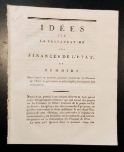 [FINANCES] - Idées sur la restauration des finances de l'Etat, ou mémoire dans lequel on examine plusieurs projets sur les finances de l'Etat, et qui expose un plan simple, pour assurer leur restauration. A Paris, De l'Imprimerie de Monsieur, 1789, in-4, 35 pp., dérelié.