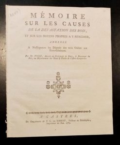 FOSSÉ. Mémoire sur les causes de la dévastation des bois, et sur les moyens propres à y remédier, adressé à nosseigneurs les députés des trois ordres aux États-Généraux. A Castres, de l'imprimerie de P. G. de Robert, 1789, in-4, 14 pp., dérelié.
