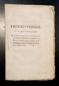 170. [FRANSQUIN (Pierre-Antoine)]. Procès-verbal de ce qui s'est passé à l'Assemblée générale des Gardes-Nationales confédérées de Franche-Comté, partie d'Alsace et de Champagne, tenue en la ville de Dole le 21 février 1790. A Dole, Joly, 1790, in-8, 45 pp., broché.