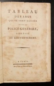 [GALANT (Albert)]. Tableau des abus qui se sont glissés dans la police générale, adressé au gouvernement. Paris, Belin, an 4e, (1795), in-8, 32 pp. (dont VI), demi-toile verte (reliure du XIXe siècle). Petits manques au dos.