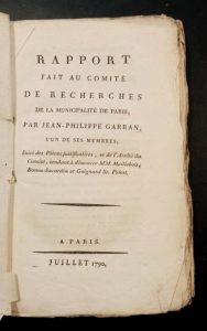 GARRAN DE COULON (Jean-Philippe). Rapport fait au Comité des Recherches de la municipalité de Paris (...); suivi des pièces justificatives, et de l'arrêté du Comité, tendant à dénoncer MM. Maillebois, Bonne-Savardin et Guignard St-Priest. Paris, Imprimerie du Patriote Français, juillet 1790, in-8, [4]-52-151 pp., broché sous couv. d'attente.