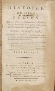 181. [GUILLON DE MONTLEON (Aimé)]. Histoire du siège de Lyon, des événemens qui l'ont précédé et des désastres qui l'ont suivi, ainsi que de leurs causes secrètes, générales et particulières (depuis 1789 jusqu'en 1796). Accompagnée d'un plan où sont indiqués les actions principales, les batteries ds combattans, les lieux incendiés et les édifices démolis. Paris, Le Clère, Lyon, Vve Rusand, J. Daval, 1797 - an 5, 2 tomes en un vol. in-8, [4]-20-255-[5]-258 pp., avec un plan dépliant hors-texte, basane fauve marbrée, dos à nerfs cloisonné et fleuronné, tranches rouges (reliure de l'époque). Accroc en coiffe inférieure, coins abîmés.