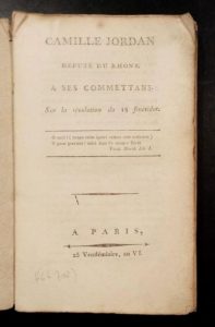 196. JORDAN (Camille). Camille Jordan, député du Rhône, à ses Commettans, sur la Révolution du 18 fructidor. Paris, an VI, in-8, (2)-II-144 pp., broché, premier plat de couv. de papier fantaisie de l'époque conservé.