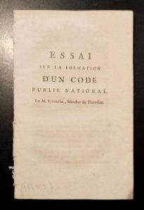 213. LE PRINCE. Essai sur la formation d'un code public national. Par M. Ecnirp'el, Membre du Tiers-Etat. S.l., (1789), in-8, 134 pp., dérelié.