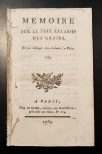 215. [LEBRET]. Mémoire sur le prix excessif des grains. Par un citoyen des environs de Paris. A Paris, chez Le Clere, 1789, in-8, 118 pp.