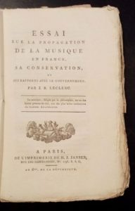 216. LECLERC (Jean-Baptiste). Essai sur la propagation de la musique en France, sa conservation, et ses rapports avec le gouvernement. À Paris, De l'Imprimerie de H. J. Jansen, an VI, (1798), in-8, 72 pp., broché, couv. rose d'attente. Important mque au dos.