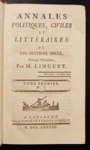 219. LINGUET (Simon-Nicolas-Henri). Annales politiques, civiles et littéraires du dix-huitième siècle. Ouvrage périodique. A Londres, A Paris, Chez l'Auteur, 1778-1790, 15 vol. in-8, basane brune, dos à nerfs orné (reliure de l'époque). Qqs accrocs aux coiffes, épid. Exemplaire convenable.