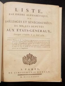222. LISTE par ordre alphabétique de bailliages et sénéchaussées, de MM. les députés aux États-Généraux, convoqués à Versailles le 27 avril 1789. A Paris, Imprimerie Royale, 1789, in-4, 88 pp., demi-vélin ivoire, étiquette de titre sur le premier plat (rel. à l'imitation).