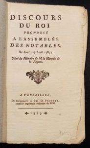 227. LOUIS XVI. Discours du Roi prononcé à l'Assemblée des Notables, du lundi 23 avril 1787. Suivi du Mémoire de M. le Marquis de La Fayette. Versailles, Ph.-D. Pierre, 1787, in-8, 14 pp., broché, couv. muette de l'époque.