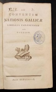 228. [LOUIS XVI] - Ad conventum nationis Gallicae libellus paraeneticus ex Gallico. S.l. [Hongrie], 1797, in-8, 86 pp., broché sous couverture d'attente bleue. Manques de papier au dos.