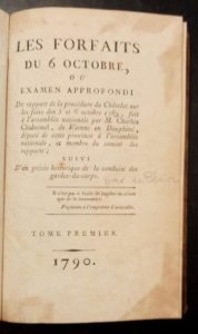 [LUCAS DE BLAIRE (Pierre-Paul-Sylvain)]. Les Forfaits du 6 octobre, ou Examen approfondi du Rapport de la procédure du Châtelet sur les faits des 5 et 6 octobre 1789 ; fait à l'Assemblée nationale par M. Charles Chabroud, de Vienne en Dauphiné, député de cette province à l'Assemblée nationale. S.l., 1790, 2 vol. in-8, 365 et [4]-312-L pp., demi-basane fauve à coins, dos lisses ornés de filets dorés, pièces de titre et de tomaison, tranches jaunes (reliure de l'époque). Une coiffe supérieure rognée, accrocs aux pièces de tomaison.