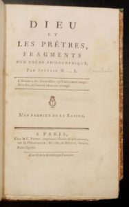 243. [MARECHAL (Pierre-Sylvain)]. Dieu et les prêtres, fragments d'un poëme philosophique. Par Sylvain M... L. L'an premier de la Raison. Paris, Patris, an II, (1793), in-8, xxvj-115 pp., feuillet de faux-titre remonté et consolidé, demi-veau blond, dos à nerfs à caissons dorés ornés de grotesques, pièce de titre cerise, tête dorée (E. Pouget). Manque un coin inférieur, un nerf abîmé.