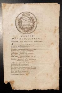 248. [MARSEILLAISE] - [ROUGET DE LISLE (Claude-Joseph)]. La Nation et la loi. Liberté, égalité. Marche des Marseillois, chantée sur différens théâtres [Avec :] La Carmagnole des royalistes. Paris, A. Daniel, s.d., (1792), in-8, 2-2 pp., en feuille. Rousseurs abondantes, consolidation de papier à la pliure, en haut et en bas.
