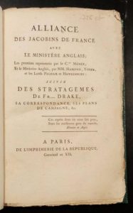 [MÉHÉE DE LA TOUCHE (Jean-Claude-Hippolyte)]. Alliance des Jacobins de France avec le ministère anglais ; les premiers représentés par le Cen. Méhée, et le ministère anglais par MM. Hamond, Yorke, et les Lords Pelham et Hawkesbury : suivie des stratagèmes de Fr Drake, sa correspondance, ses plans de campagne, &c. À Paris, de l'Imprimerie de la République, an XII-1804, in-8, 276 pp., demi-basane maroquinée verte, dos à nerfs (rel. moderne). Qqs rousseurs.