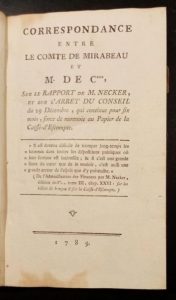261. MIRABEAU (Honoré-Gabriel Riqueti de). Correspondance entre le comte de Mirabeau et M. de C*** [Cerutti], sur le rapport de M. Necker, et sur l'arrêt du Conseil du 29 décembre, qui continue pour six mois, force de monnoie au papier de la Caisse d'Escompte. S.l., 1789, in-8, 48 pp., demi-basane fauve, dos à nerfs orné de filets dorés, tranches mouchetées de rouge (reliure de l'époque). Coiffes rognées, mors inf. fendu.