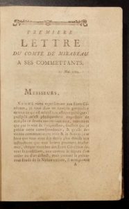 265. MIRABEAU (Honoré-Gabriel Riqueti de). Première [- Dix-septième] lettre du comte de Mirabeau à ses commettants. S.l., 1789, 17 (sur 19) livraisons en un vol. in-8, pagination multiple, demi-basane havane, dos lisse orné de filets et guirlandes dorés, tranches mouchetées (rel. du XIXe s.). Dos frotté.