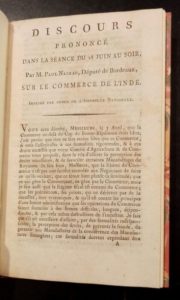 NAIRAC (P.). Discours, prononcé dans la séance du 28 juin au soir, sur le commerce de l'Inde. Paris, Imprimerie Nationale, s.d., (1790), in-8, 15 pp., bradel papier marbré (rel. moderne).