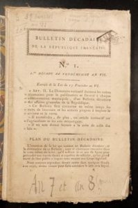 Notre collection regroupe en effet 35 des 36 numéros de l'an VII (à l'exception du numéro 5, manquant), et les 4 premiers numéros de l'an VIII (à l'exception du numéro 5, dernier à paraître), ce qui correspond à une période qui va de septembre 1798 à novembre 1799.