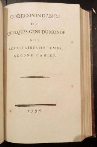 305. [PERIODIQUE] - Correspondance de quelques gens du monde sur les affaires du tems. [Paris], Dennée, s.d., (1790), 2 parties en un vol. in-8, 160-128 pp., demi-chagrin grenat, dos à nerfs orné de fleurons dorés, quelques couvertures imprimées conservées (rel de la fin du XIXe). Mouillure angulaire en début d'ouvrage. Bon exemplaire.