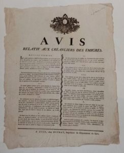 [PLACARD - EMIGRES] - Avis relatif aux créanciers des émigrés. Auch, Duprat, s.d., (février 1794), placard in-folio (42 x 33,5 cm), texte sur deux colonnes.