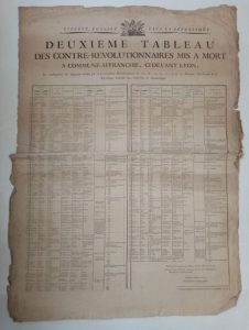 315. [PLACARD - LYON] - Liberté, égalité. Vive la République. Deuxième tableau des contre-révolutionnaires mis à mort à Commune-affranchie, ci-devant Lyon, en conséquence des jugemens rendus par la Commission révolutionnaire les 16, 18, 19, 20, 21, 23 & 25 frimaire, l'an second de la République française, une, indivisible & démocratique [6 au 15 décembre 1793]. Commune-affranchie, Imprimerie de Revol, s.d., (1793), deux placards in-folio oblongs de 51 x 64 cm. En feuilles.