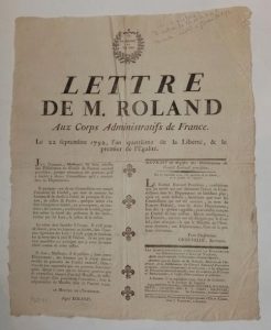 320. [PLACARD] - Lettre de M. Roland aux corps administratifs de France. Le 22 septembre 1792, l'an quatrième de la Liberté, & le premier de l'Egalité. Rennes, J. Robiquet, s.d., (1792), placard in-folio (43 x 35 cm), texte sur deux colonnes, séparées (encore) par une frise fleurdelisée.