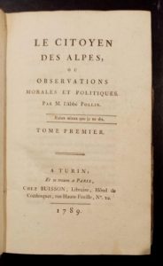 323. POLLIN (Jean-Baptiste). Le Citoyen des Alpes, ou Observations morales et politiques. Turin-Paris, Buisson, 1789, 2 tomes en un vol. in-8, XII-305-[6]-308-[2] pp., demi-basane fauve marbrée, dos lisse orné de filets dorés, pièce de titre cerise, tranches mouchetées de bleu (reliure de l'époque). Accroc en coiffe supérieure, coins et coupes frottés.