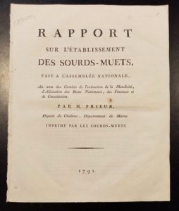 PRIEUR DE LA MARNE (Pierre-Louis). Rapport sur l'établissement des sourds-muets, fait à l'Assemblée Nationale, au nom des Comités de l'extinction de la mendicité, d'aliénation des biens nationaux, des finances et de constitution. Imprimé par les sourds-muets. Paris, Imprimerie des sourds-muets, 1791, in-4, [2]-10 pp., dérelié.