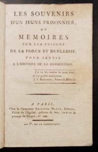 330. [PRISONS] - Les Souvenirs d'un jeune prisonnier, ou Mémoires sur les prisons de la Force et Duplessis, pour servir à l'histoire de la Révolution. Paris, Brigitte Mathé, an III, (1794), in-8, 88 pp., broché, couv. papier rose. Tache brune en haut des feuillets.