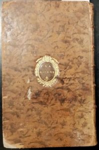340. [RELIURE RÉVOLUTIONNAIRE - DILIGENCES] - Etat général du service des diligences, messageries nationales, coches et voitures d'eau de France. Paris, Ballard, 1792, in-8, [8] ff. n. ch., pp. xvii-xl, 112 pp., avec 3 tableaux dépliants, basane fauve marbrée, dos à nerfs cloisonné et fleuronné, pièce de titre, médaillon doré poussé au centre des plats avec au milieu la mention "La Loi, le Roi" sur le plat supérieur, et "La Liberté" sur le plat inférieur, hachuré doré sur les coupes, tranches rouges (reliure de l'époque). Début de fente aux mors, épidermures.