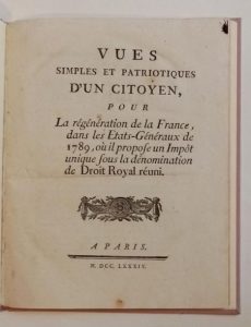 349. [RIOUX DE MAILLOU]. Vues simples et patriotiques d'un citoyen, pour la régénération de la France dans les Etats-Généraux de 1789, où il propose un impôt unique sous la dénomination de droit royal réuni. Paris, s.n., 1789, in-4 carré, 46 pp., cartonnage Bradel de papier rose, dos lisse, pièce de titre cerise en long (reliure moderne). Bon exemplaire.