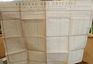 353. [ROLAND DE LA PLATIERE (Jean-Marie)]. Tableau des dépenses ordonnées par J. M. Roland, ministre de l'Intérieur, depuis le 10 août 1792, jusqu'au dernier décembre suivant. Paris, Imprimerie Nationale exécutive du Louvre, 1793, grand tableau in-plano (110 x 84 cm). En feuille. Traces d'usure au niveau des pliures.