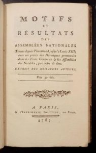 355. [RONDONNEAU DE LA MOTTE (Louis)]. Motifs et résultats des Assemblées Nationales tenues depuis Pharamond jusqu'à Louis XIII ; avec un précis des harangues prononcées dans les États Généraux et les Assemblées des notables, par ordre de date, extrait des meilleurs auteurs. Paris, Imp. Polytype, 1787, in-8, 105 pp., demi-basane à coins, dos à nerfs, tête dorée (reliure moderne).