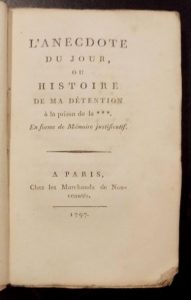 356. [ROSNY (Joseph de)]. L'Anecdote du jour, ou Histoire de ma détention à la prison de la ***. En forme de mémoire justificatif. Paris, chez les marchands de nouveautés, 1797, in-16, 128 pp., broché sous couverture d'attente de papier rose.