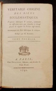 ROZET. Véritable origine des biens ecclésiastiques. Fragmens historiques & curieux, contenant les différentes voies par lesquelles le clergé séculier et régulier de France s'est enrichi. Accompagnés de Notes historiques et critiques. A Paris, chez Desenne, 1791, 2 tomes en 1 vol. in-12, VIII-243-173-[1] pp., demi-basane havane à coins, dos à nerfs orné de filets dorés (reliure de l'époque). Bon exemplaire.