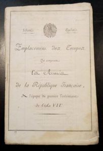 369. [SITUATION DES TROUPES] - Liberté. Egalité. Emplacement des troupes qui composent les armées de la République Française, à l'époque du premier vendémiaire de l'an VII [22 septembre 1798]. Paris, Imprimerie de la République, an VI, (1798), in-4, 79 pp., en feuilles, cousu.