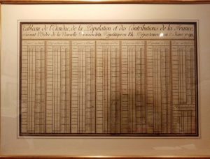 Grand tableau d'apparat entièrement manuscrit, présentant l'état de la population en France en 1793, avec l'estimation des contributions fiscales par département.