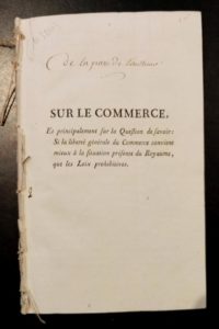 384. [THEORIES DU COMMERCE] - Sur le commerce, et principalement sur la question de savoir : si la liberté générale du commerce convient mieux à la situation présente du royaume que les loix prohibitives. S.l., 1789, in-8, 59 p., dérelié.